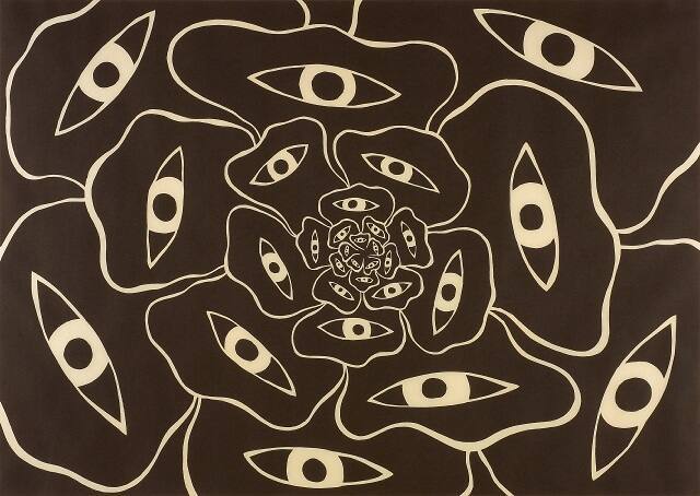 DescriptionOn dark brown ground, radial composition in off-white of ocular forms within petal-like areas circling center lotus shape comprised of gradually smaller eyes and petals.Gallery LabelThis pattern of repeated eyes, which appears to spin endlessly in a vortex, is like an image from a dream or, perhaps, even a nightmare. James Surls achieves the bold, graphic quality of this image by using the woodcut process to create a pared-down language of contrasts, in which the white line stands as the positive form against the dark brown background. He uses the eye as a motif to create abstract pattern and to allude to associations with the human eye. His meaning is purposely ambiguous. Does this vortex of eyes express all-seeing knowledge, insight or dark uncertainty? Surls' art often references American folk art and delves into the mystical aspects of nature.