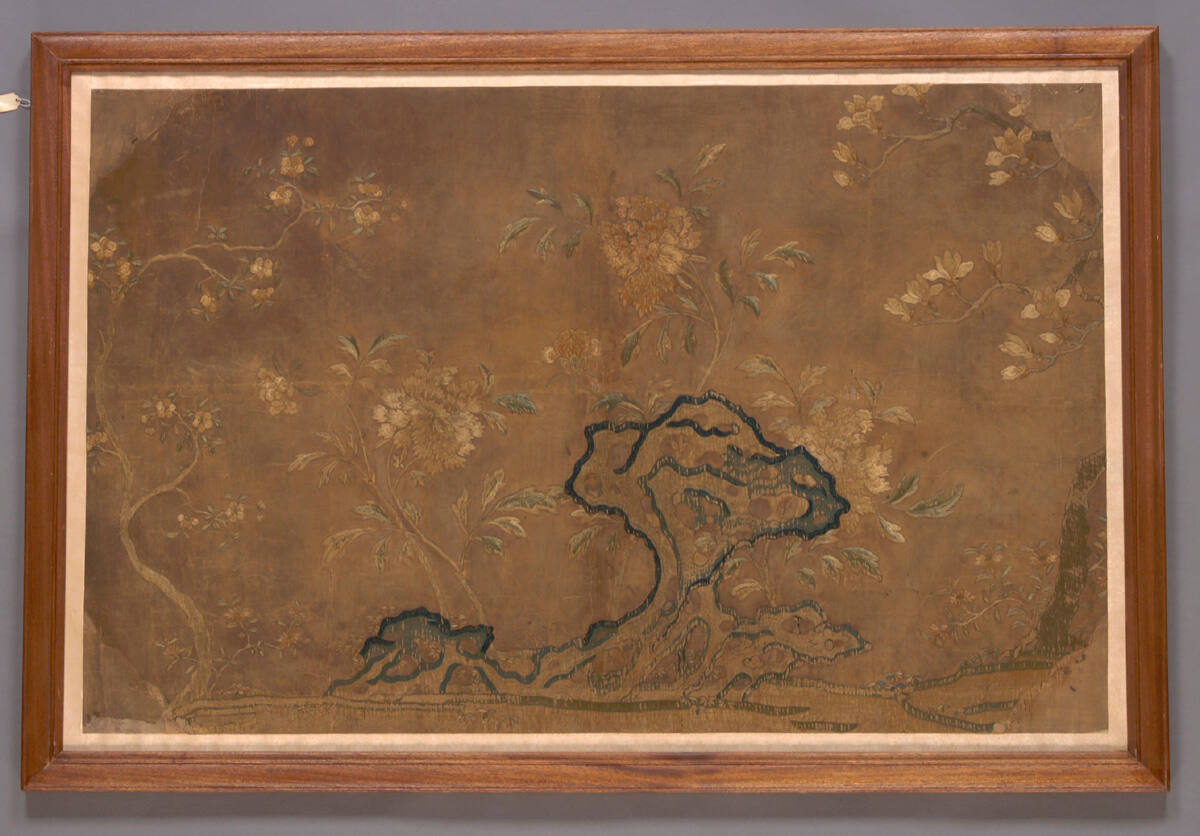 DescriptionScene of flowers and rocks, done in blue and yellow on yellowish silk. Mounted on paper. Paneled.ProvenancePurchased on the Chinese art market, through Laurence Sickman, by The Nelson-Atkins Museum of Art, Kansas City, MO, 1934 [1].