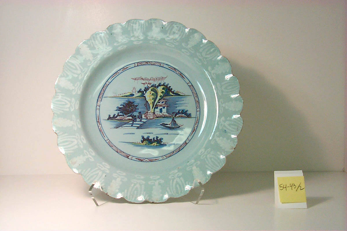 DescriptionBlue-white plates painted with Chinese lake scene in dark blue, manganese, and yellow. Crinkled borders decorated in opque white, bianco sopra bianco.Exhibition HistoryRoss E. Taggart, The Frank P. and Harriet C. Burnap Collection of English pottery in the William Rockhill Nelson Gallery, (Kansas City, MO: Nelson Gallery and Atkins Museum, 1967), 57, no. 162.