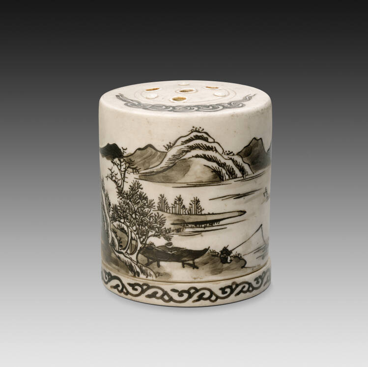DescriptionBiscuit with paited landscape in gray and blackProvenanceFanny Pomeroy Brown;
