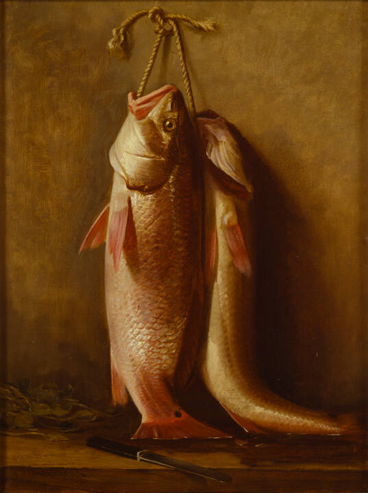 DescriptionTwo pink and gold fish suspended on a rope tied in a know around a screw-eye, top center. Tails extend over shelf, bottom, on which lie leaves, left, and black-handled knife, left center.Published ReferencesNAMA 1959, 257 (as Red Snappers); NAMA 1973, 254 (as Red