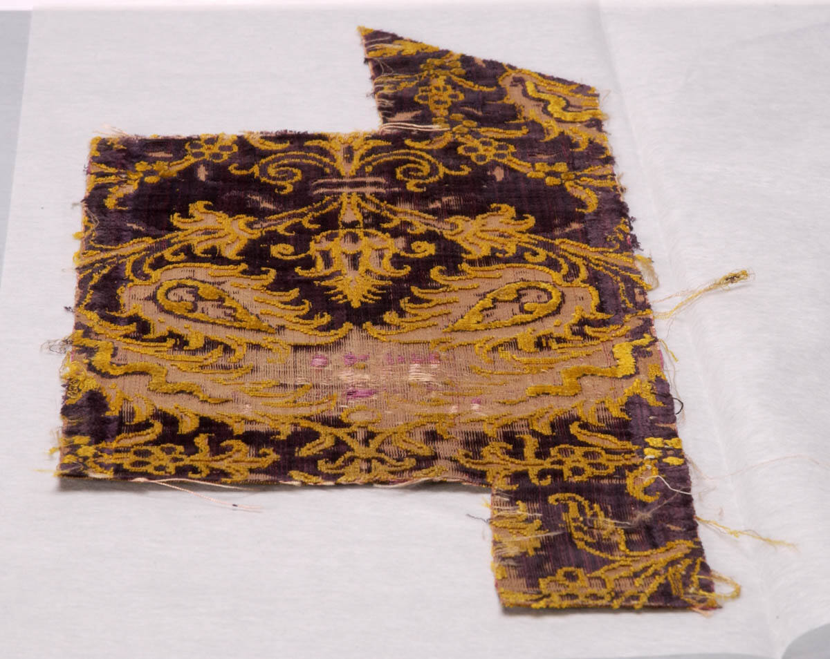 DescriptionPurple background, palmette design in old gold and beige.