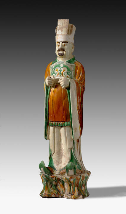 DescriptionFigure of an official with mustache and beard, wearing high headdress, long belted robe with wide sleeves and standing collar; green-glazed robe with design in aubergine, green, buff, and dark yellow, worn over buff-colored underrobe, with dark yellow border. Shoes, upturned toes.ProvenanceBraganza Investments, Ltd.;