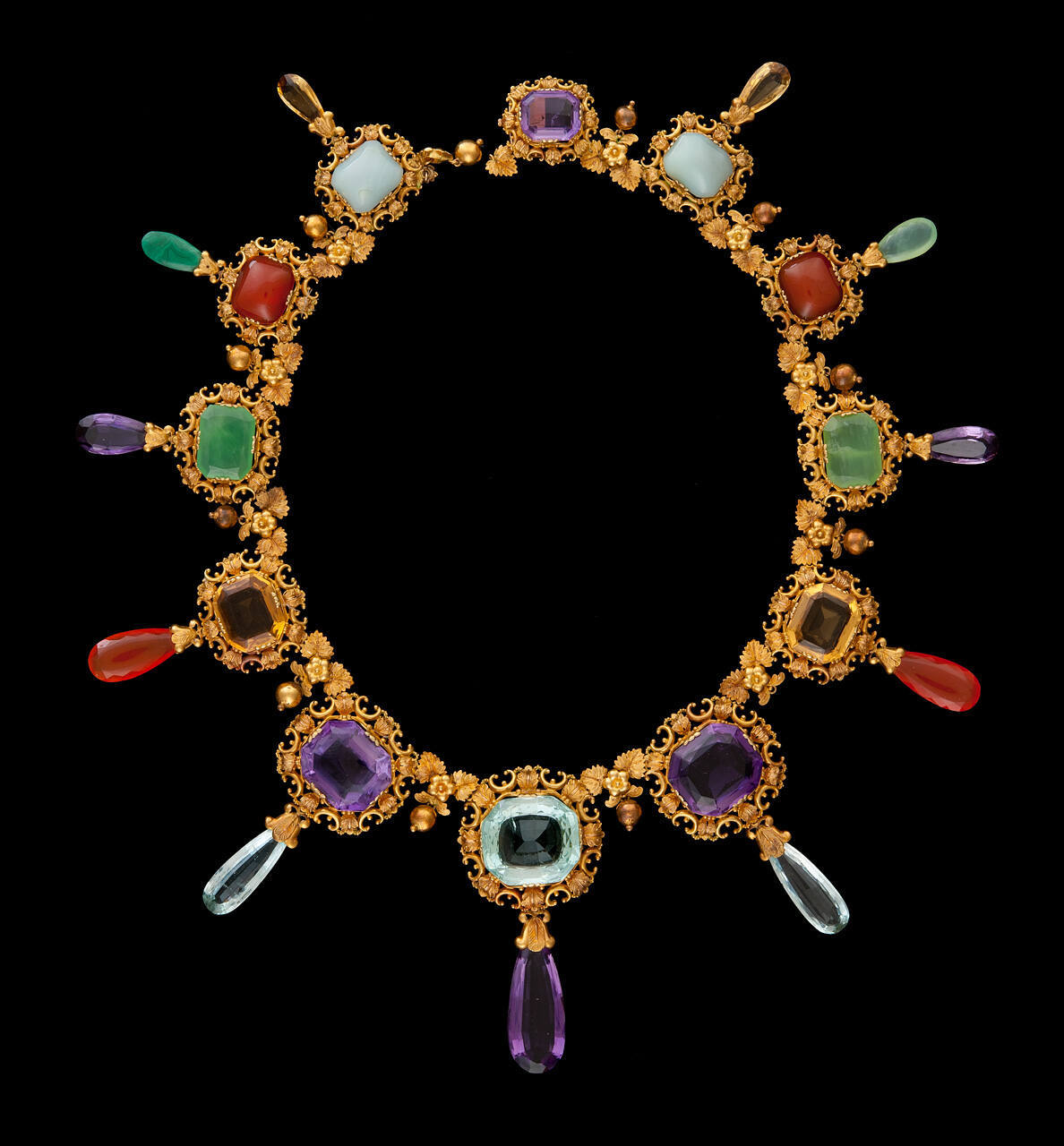 DescriptionGold necklace set with aquamarine, amethyst, topaz, jade, carnelian, and moonstones, with pendants of same gems.Gallery LabelWomen's fashion of the early and mid-1800s influenced jewelry design. Necklaces complemented low-cut necklines and V-shaped bodices. Earrings were made long enough to be visible under bonnets, hats, and elaborate hairstyles. Brooches were worn many places-at the waist, in the hair, or on ribbons as necklaces or bracelets. These two sets of jewelry, owned by Kansas City philanthropist Ella Loose, would have been worn as a part of her evening dress.