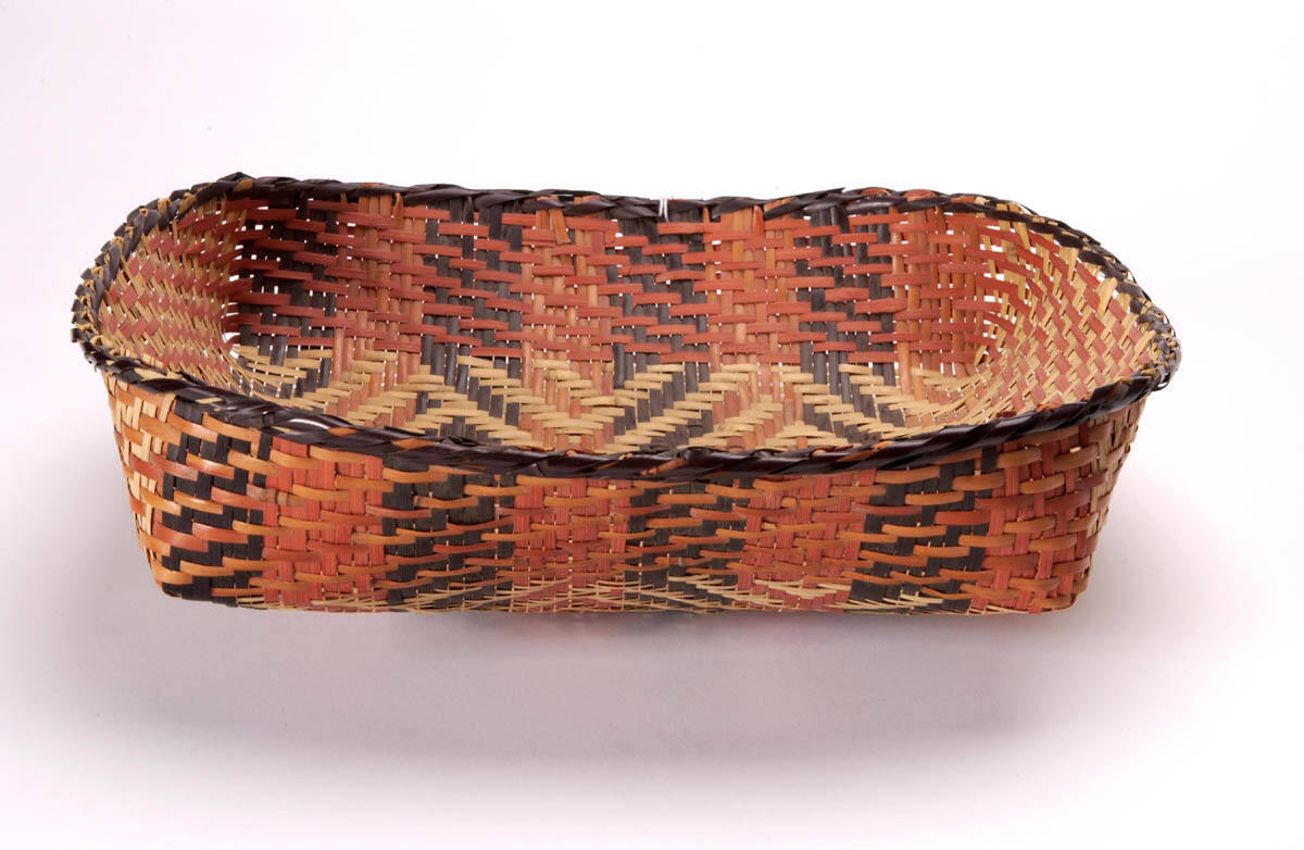 DescriptionSplit cane twilled basket, shallow with a roughly square mouth and rounded bottom, woven with three colors of cane in different diamond pattern or zig-zag designs.