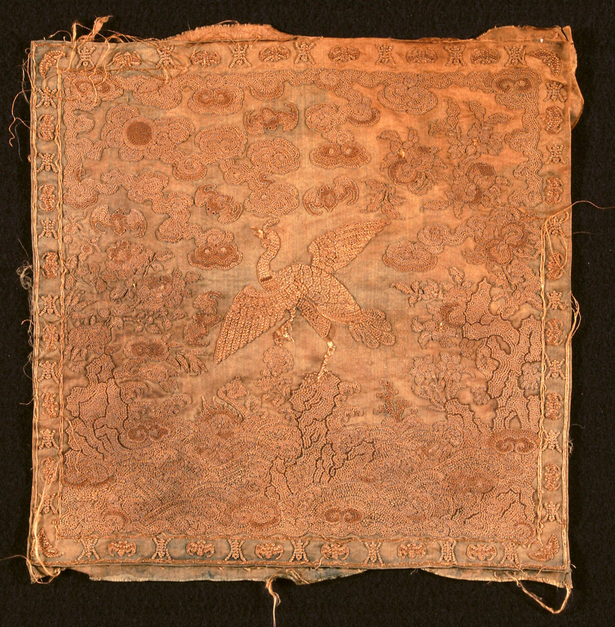 DescriptionMandarin square for front of robe. Tan silk embroidered in Peking stitch and couched twist. Crane(?) standing on rocks and clouds, peaches, bats, and flowers. Badge of civil official.