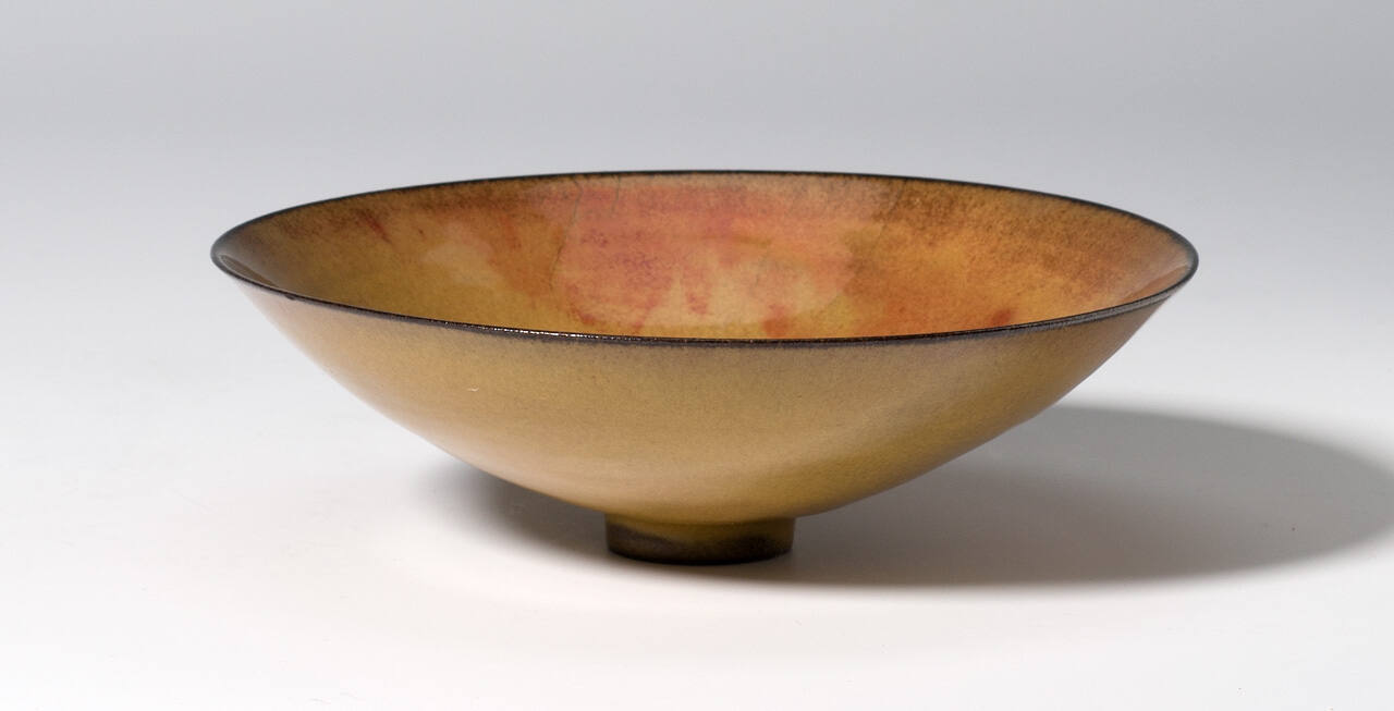 DescriptionBowl has smooth, shiny yellow/peach glaze. Edge of rim is black.Gallery LabelThe husband and wife team of Otto and Gertrud Natzler combined Gertrud's elegant forms and Otto's glaze formulations to create intimately scaled vessels enhanced with rich colors and textures. Otto describes their work: "We focused our interest on exploring form in its totality-searching for perfection of outline and proportion-and relating to its color and texture of the surface." Their continual experimentation with materials and methods led to these wafer-thin vessels that glow from both vibrantly and subtly hued glazes. The Museum has benefitted enormously from generous Kansas City collectors of the Natzlers' work, including John R. and Mary Louise Womer and the Jedel Family Foundation.