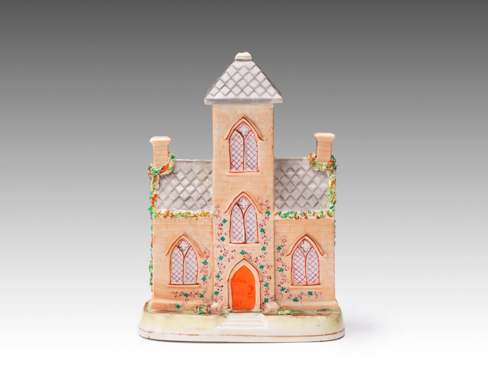 DescriptionGothic style cottage with pointed arched windows outlined in vermillion against pale salmon-colored walls. Orange door. Painted vines on facade. Grey slate roof with chimneys at each end. Roof of central tower is removable. Multicolor vines outlining roof and down each end.Exhibition HistoryCastles, Cottages, and Crime, The Nelson-Atkins Museum of Art, Kansas City, Missouri, July 10 2021–March 06 2022, no cat.