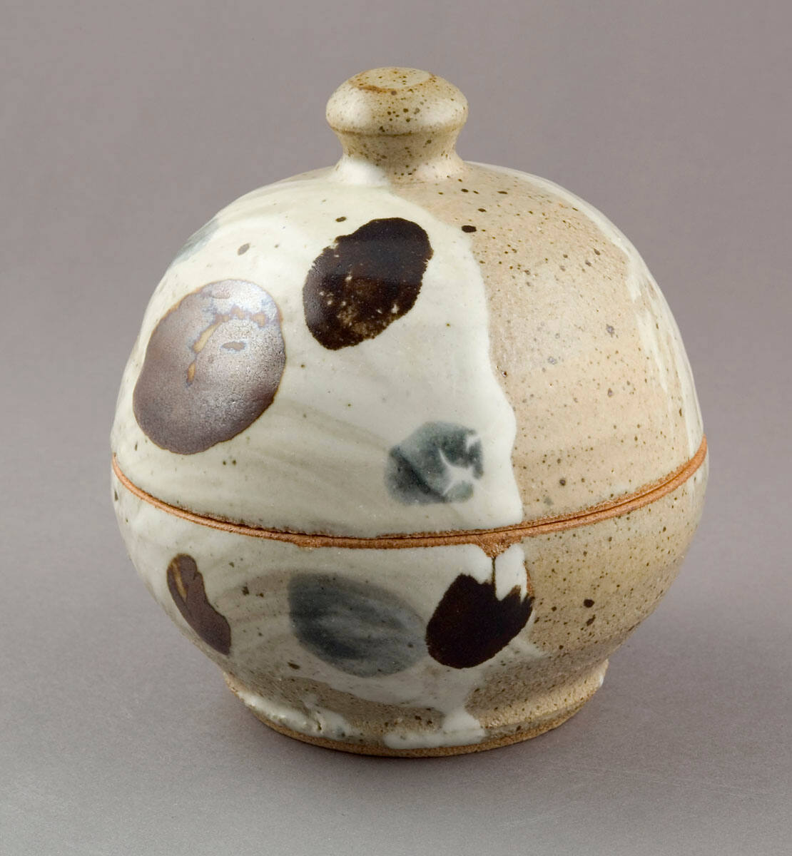 DescriptionGlobular form. equator. Overall mottled beige surface over which there are large patches of white glaze, on which are spots of dark brown and blue glaze.Copyright© Estate of Warren MacKenzie