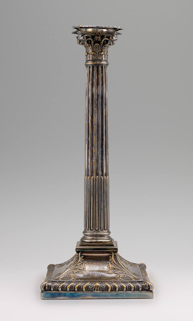 DescriptionSheffield candlestick with square base, fluted column topped with a Corinthian capital.