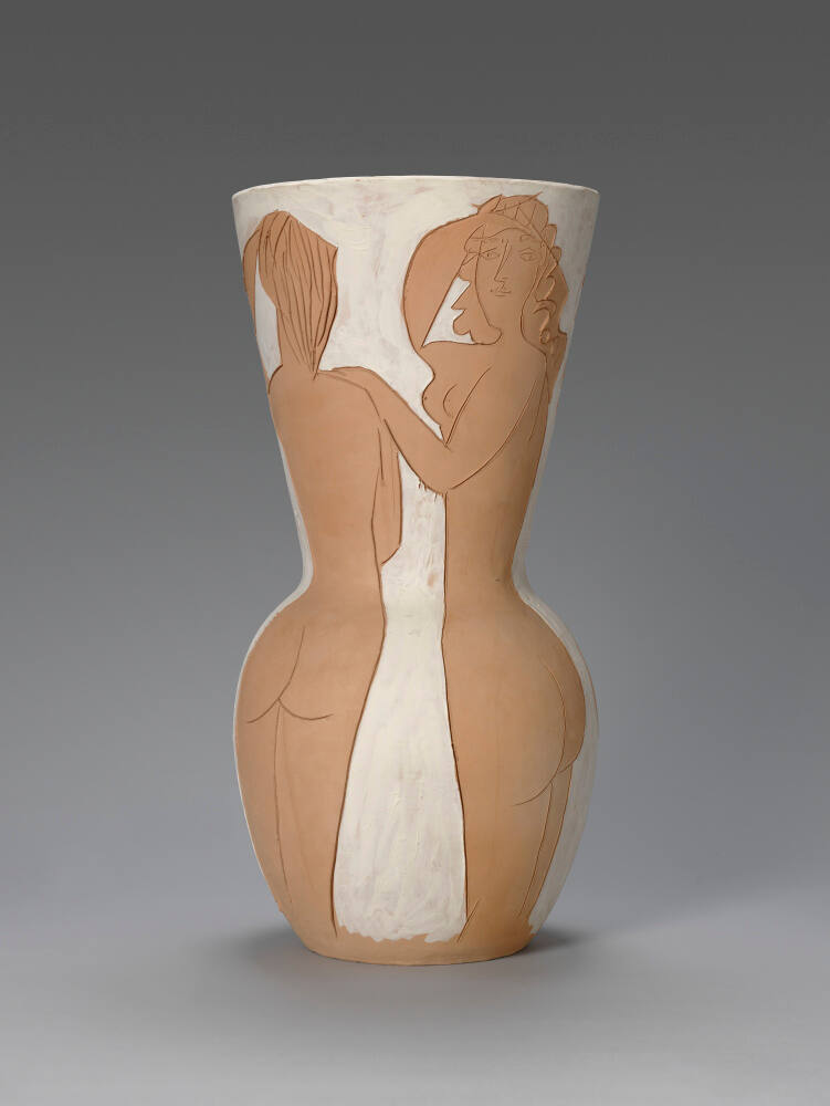 DescriptionGlobular form with tall, flaring top. Flesh-colored pottery in biscuit stage decorated in sgraffito with four nude women seen from the rear, their buttocks on the shoulder of the vase. Inscribed on inner rim "Vallauris Mai 50" and stamped "Empreinte Originale de Picasso (10)". White slip between figures on exterior.Gallery LabelPablo Picasso drew his undulating female forms to echo the shape of this curvaceous vase. It was made in collaboration with Madoura Pottery at Vallauris in the south of France. The Pottery’s owners, Georges and Suzanne Ramié, typically fashioned the bowls, pitchers, and vases upon which Picasso drew or painted with clay slips and glazes. This vase was conceived in 1950 and executed in an edition of 25.