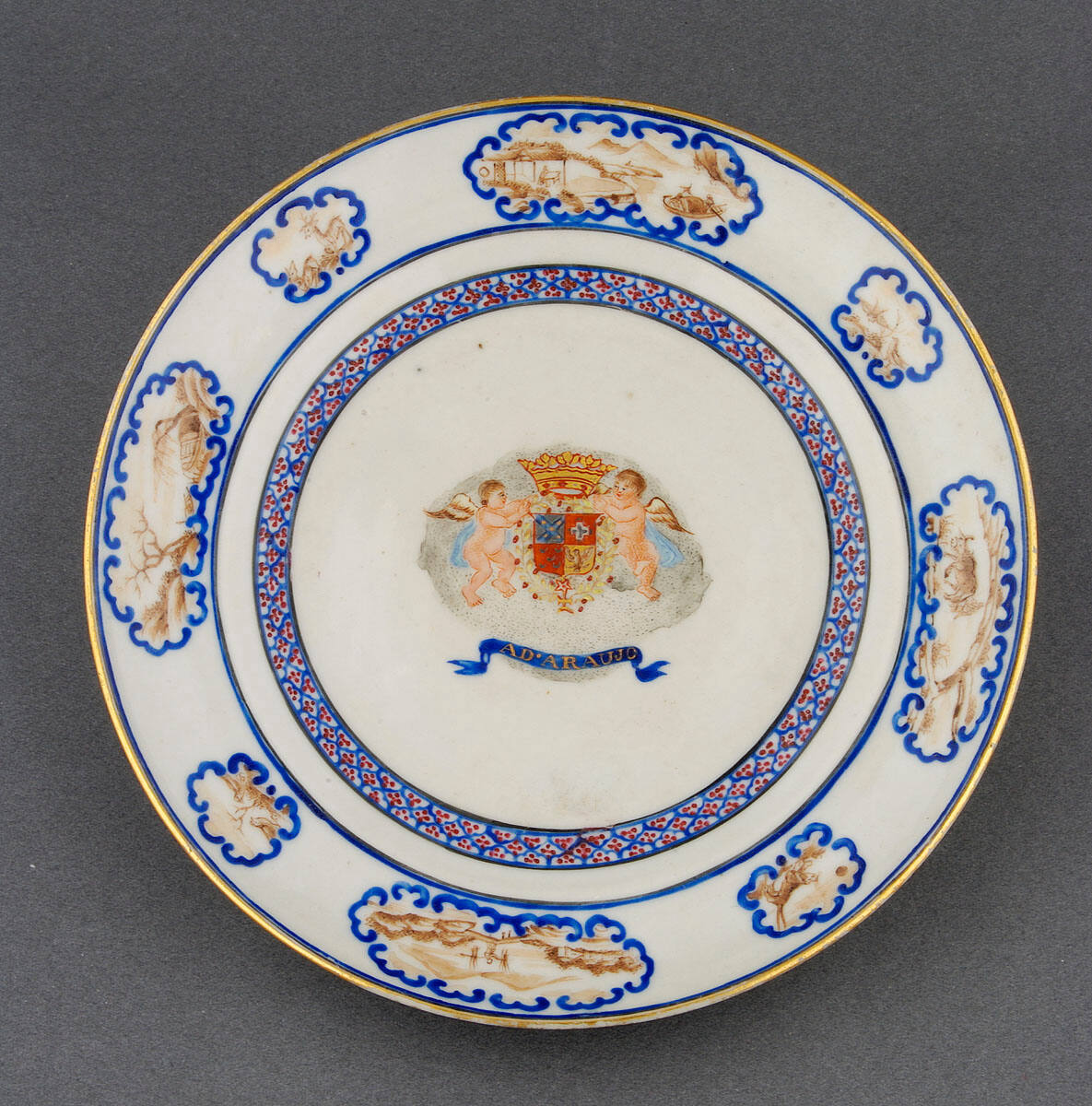 DescriptionPlate with arms of Araujo de Acevedo. Borders of small panels enclosing Chinese style landscape scenes; birds, and animals in sepia within blue outline.