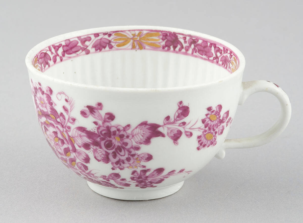 DescriptionHemispherical form with rib-molded interior, circular foot, and loop handle decorated in puce and gilding with single flower spray at bottom inside cup; floral band on inside at rim; outside decorated with flowers on rockwork base; husks on handle.ProvenanceWith Caroline Newman Newburger Berkowitz (1899–1997), Kansas City, MO, by 1983-1993 [1];