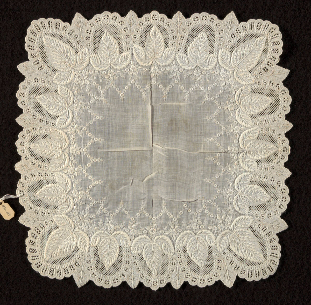 DescriptionFine cotton embroidered with cotten thread in padded satin and overcast stitches and with speckling, eyelet holes, cutwork and needle lace fittings. Drawn-thread and pulled fabric work is used to form mesh-like backgrounds.