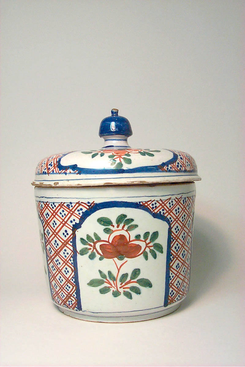 DescriptionDecorated on side and top with dark blue bordered panels enclosing red-brown flowers and green leaves. The arcuated panels are separated by red lattice-work consisting of diamonds each containing four blue dots. Blue cover knob.