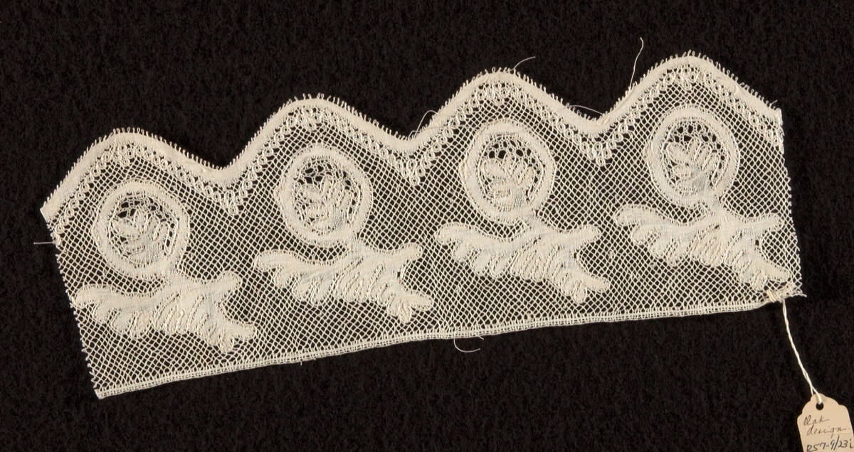 DescriptionBobbin-made straight lace with a square mesh of twisted threads and a pattern worked in whole stitch with a glossy outlining thread.