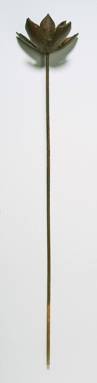 DescriptionStraight stemmed lotus blossom carved out of wood in a red-brown color.