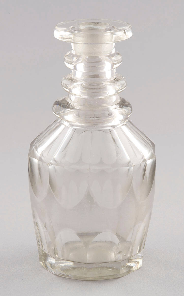 DescriptionHeavy cut glass with three annuli around neck. Slightly flaring mallet-shaped body with ten flutes at top of body and on sloping shoulder. Wide ring at top.