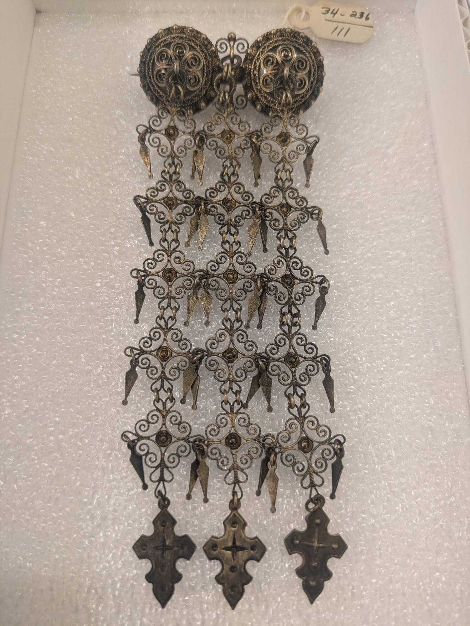 DescriptionBrooch with three long narrow pendants of gold filigree.ProvenanceElla Anna Loose (née Clark, 1860-1945), Kansas City, MO, and Washington, DC, by 1934 [1];