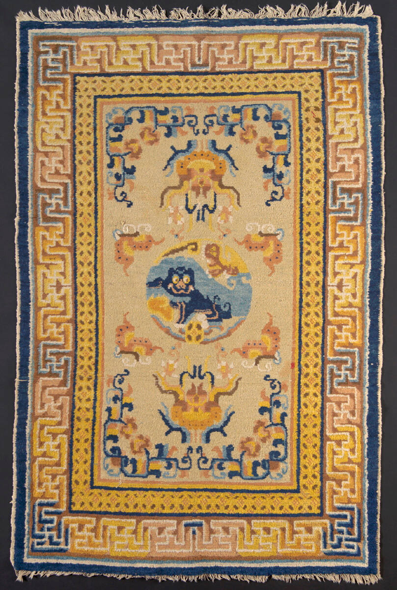 DescriptionRectangular rug with a medallion in the center of a lion in blue, surrounded by a background and borders of floral and geometric designs, in shades of blue, yellow and tan.ProvenanceWith Yung Ku Chai, Ch'ien Men Wei, Peiping, or Li Tsin Chiu, Hatamen Ta Chieh, Peiping, by July 1933 [1];