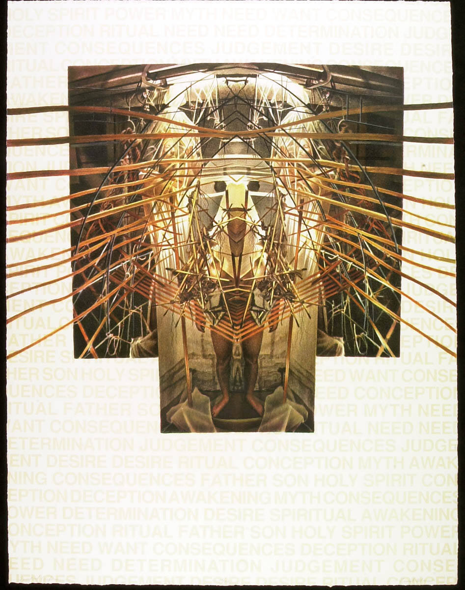DescriptionImage of a man contained in a menacing contraption with rods or poles projecting off the page. In the backgroung are two other figures ina similar situation. The image has been placed over repeated text.Copyright© David Morrison