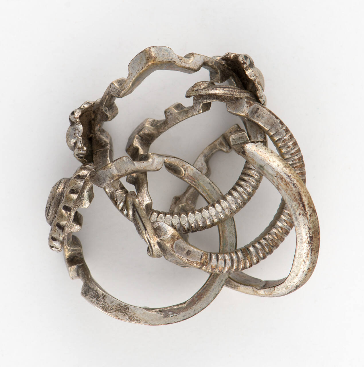 DescriptionPuzzle ring of four silver rings of irregular shapes ornamented with animals and medallions.