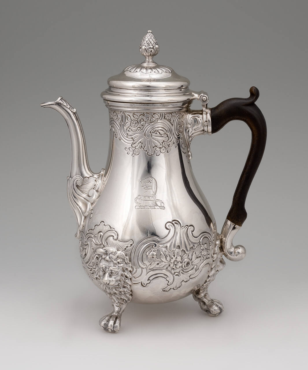 DescriptionPear-shaped silver coffee pot, with chasing of flowers, leaves and scrolls; pot stands on three lion feet with claw bases. The spout is decorated with a shell at the base and a leaf at the upper part. The domed cover is surmounted with a pineapple finial. The side of the body is engraved with a crest. Double scroll wood handle.Gallery LabelThis coffee pot's body was raised, a process by which a flat plate of silver is hammered into the desired form over an anvil. From the vessel's body, the silver was raised into the rich scrollwork infused with flowers and foliage; this process is called chasing. The pot rests on realistically rendered lions' heads and feet complete with toes and claws. These were cast and then applied. David Willaume II, a successful London silversmith, followed his father, David Willaume I.