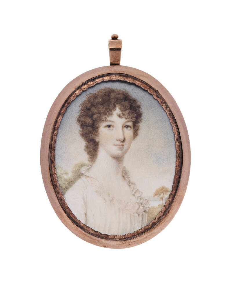 DescriptionPortrait miniature of a woman wearing a white gown before a landscape background.Exhibition History