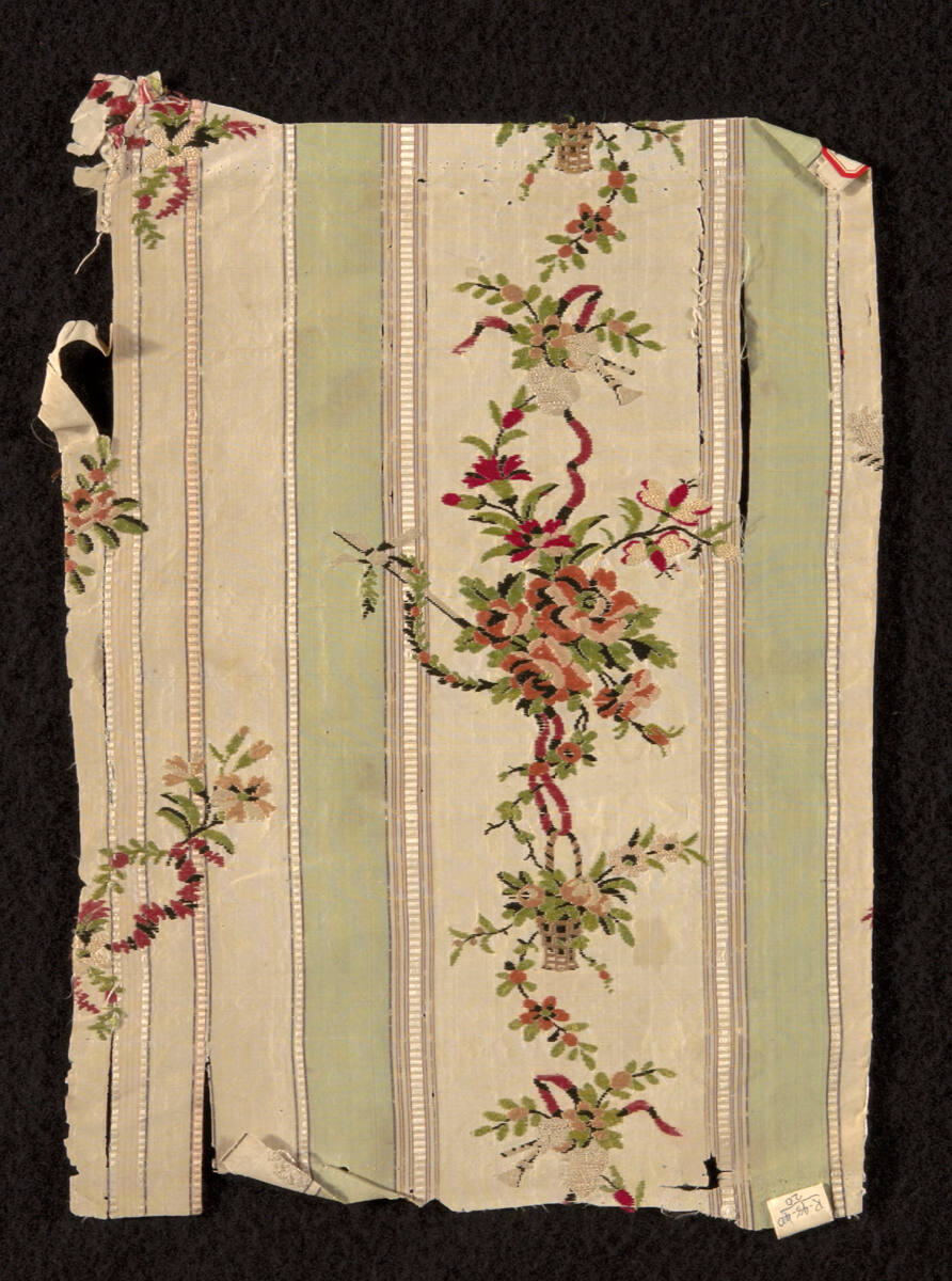 DescriptionCream and green striped silk, brocaded with polychrome silks.
