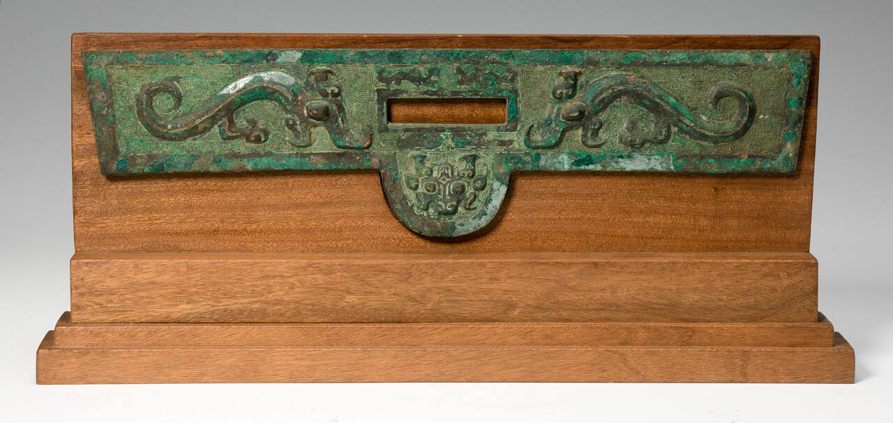 DescriptionFlat decoration with two dragons in relief facing each other; below is a Tao T'ieh mask; incised thunder pattern in background; flanges on back for attaching to chariot.ProvenanceT'ang Hsiao Wu, Peiping (modern-day Beijing), China, by March 30, 1934;