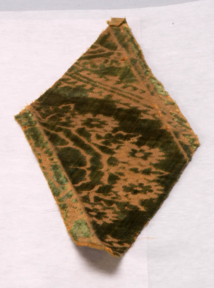 DescriptionGold conventionalized floral design cut into the green velvet.
