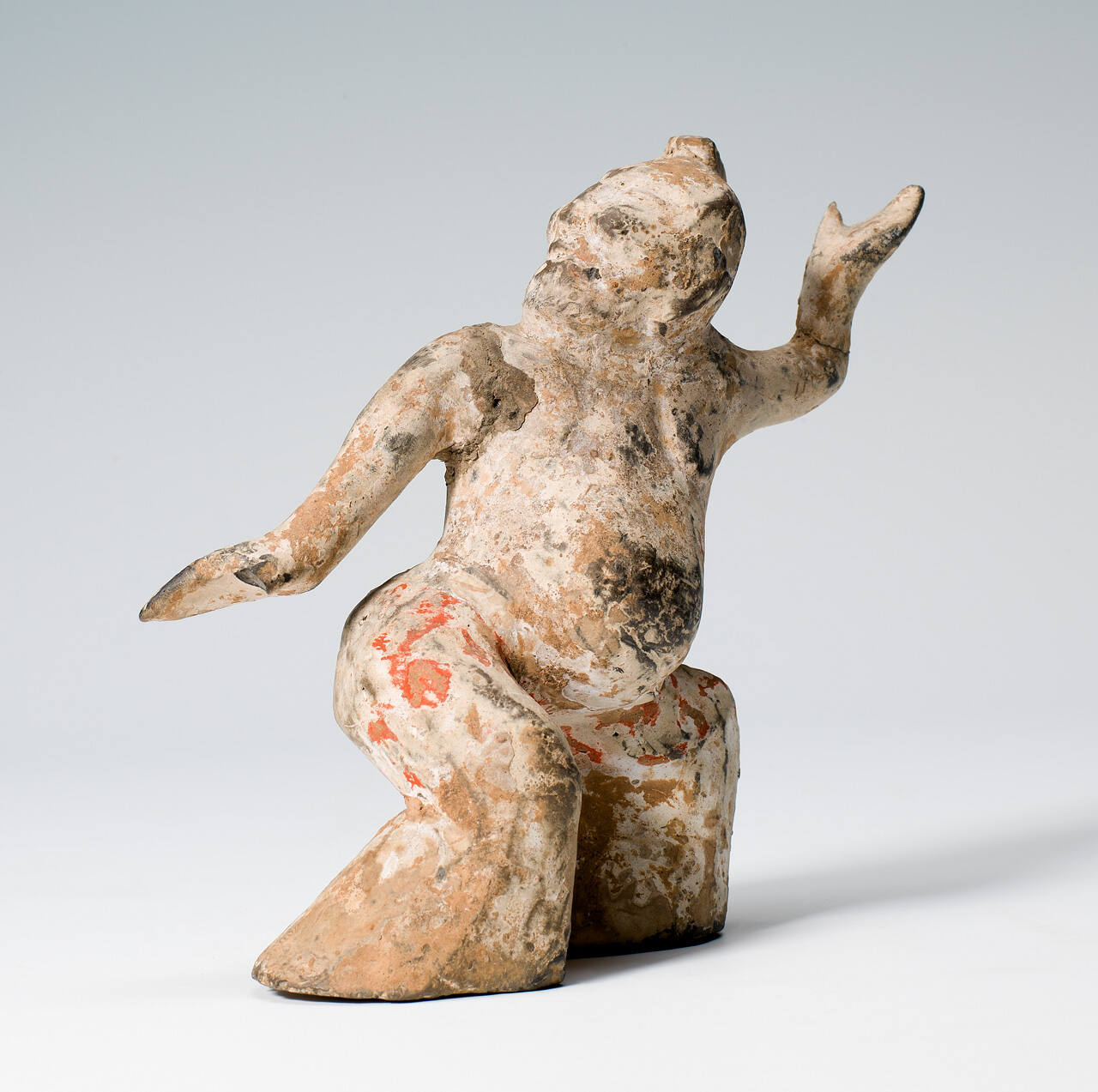 DescriptionFigure striding to the left, head turned sharply to the right, tilted up; left arm raised with elbow bent, palm open; right arm at side palm down. Protruding belly; legs bent sharply at the knees, wide ridged trousers, as if pleated. The face is broad and large, with a flat nose and high cheekbones.