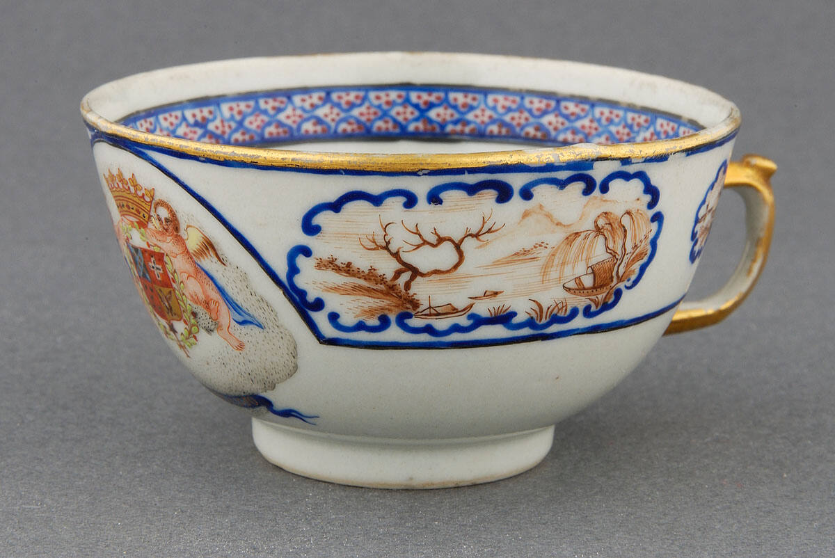 DescriptionCup with arms of Araujo de Acevedo. Borders of small panels enclosing Chinese style landscape scenes; birds, and animals in sepia within blue outline.