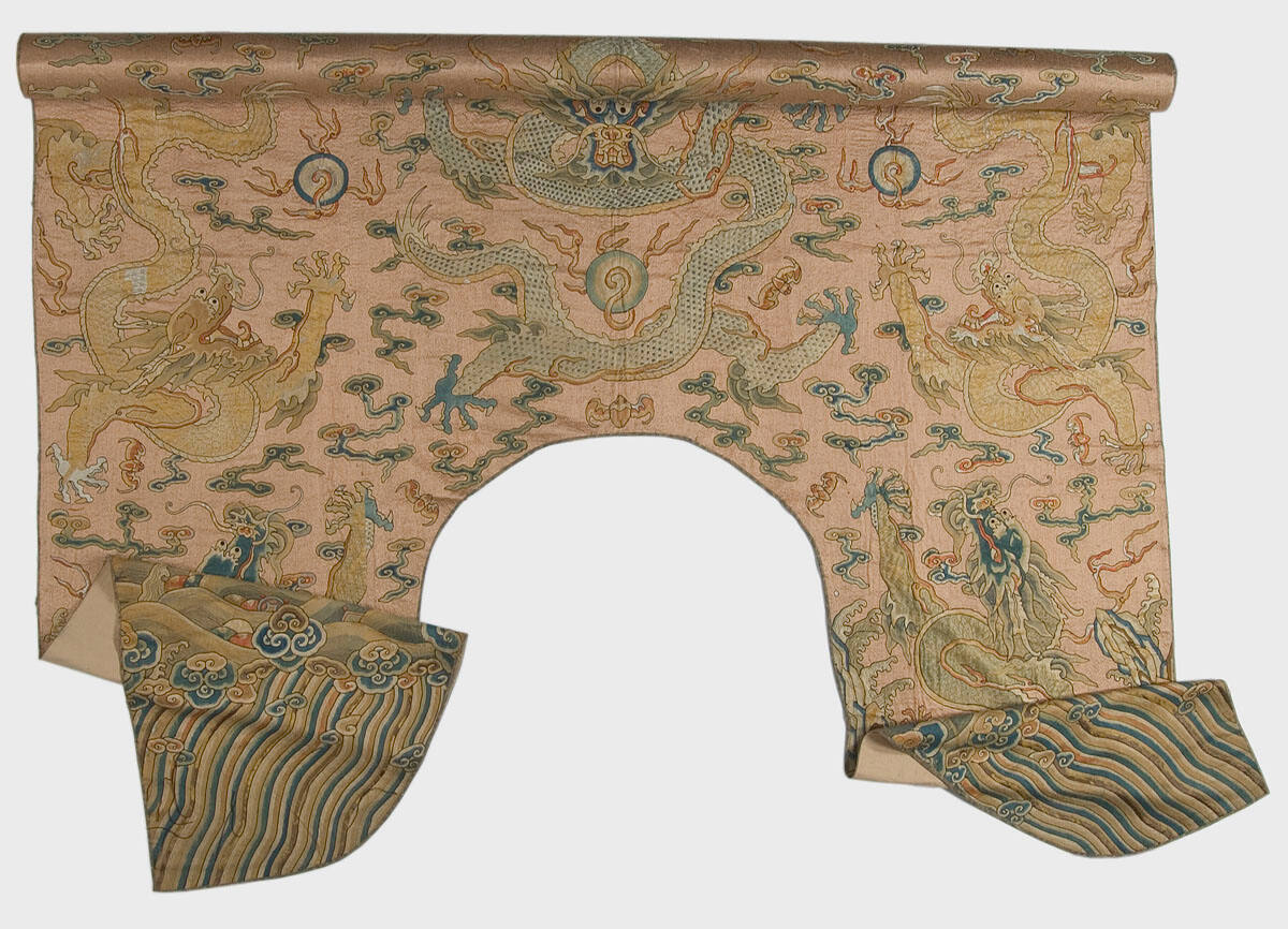 DescriptionTwo long pointed ends with wave design in blues and tans. General background yellow. Huge dragon coiled over all.