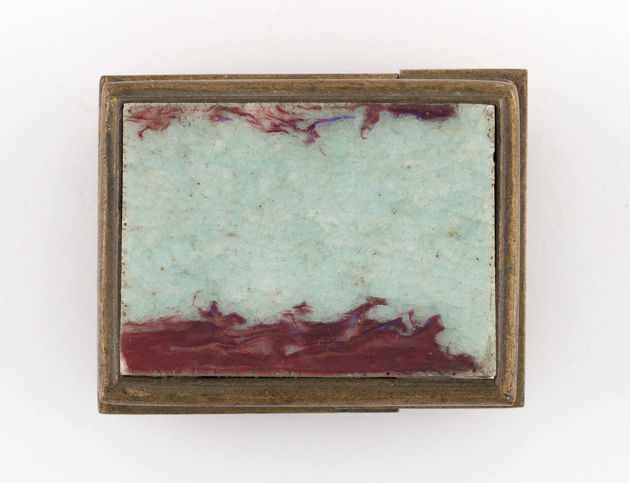 DescriptionRectangular brass buckle having set of green porcelain mottled with red.