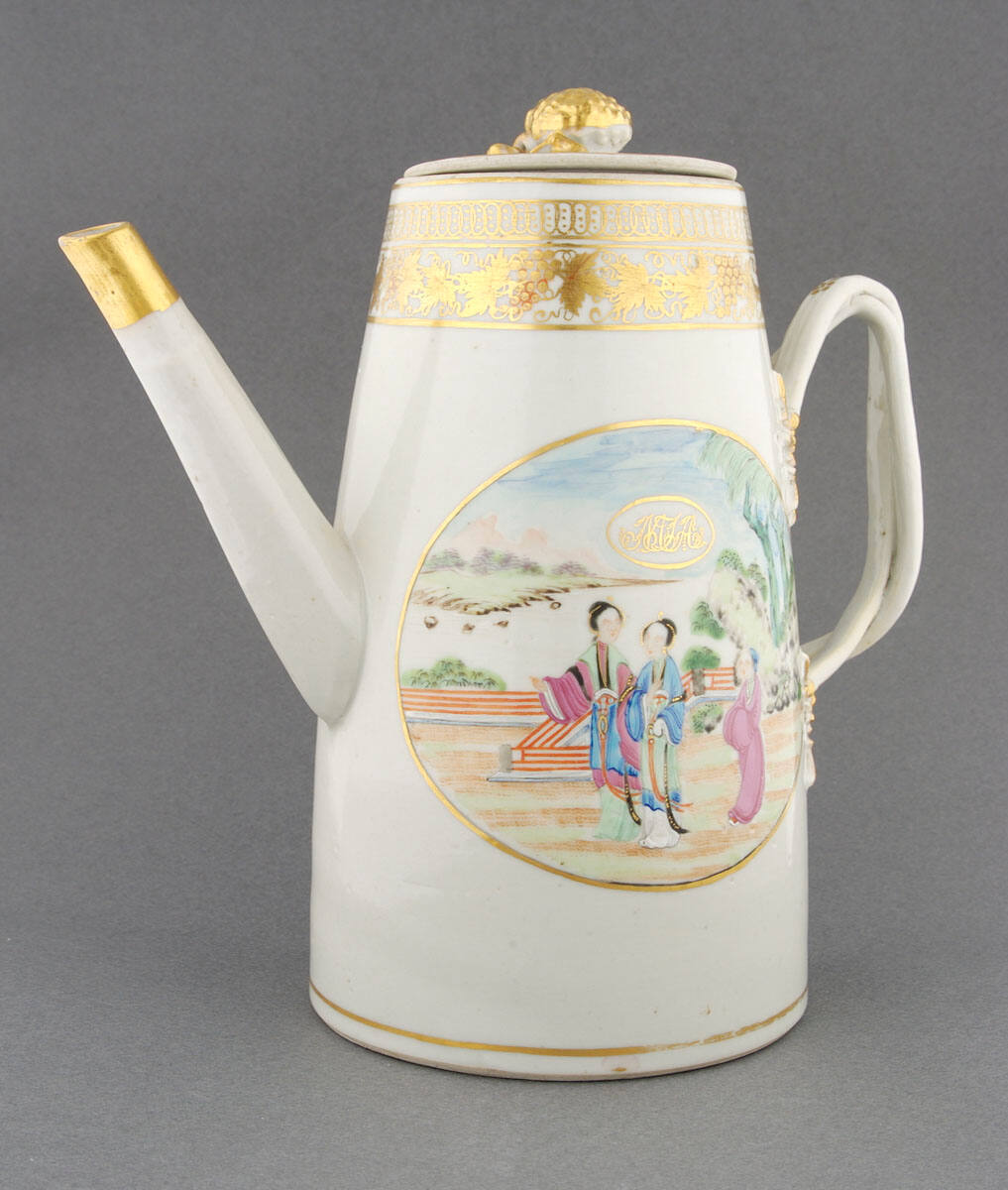 DescriptionPart of seventy-seven piece tea service. In plates and on sides of vessels and containers is scene in famille-rose style with gold monogram, MTA, above figs. Border design of gold grape bunches and leaves in plates and on lids and upper sides of vessels. Lid knobs of jam dish and pots, gold berries. Handles of truncated conical pots and cylindrical sugar, entertwining "vines" ends of which attached with gold leaves.