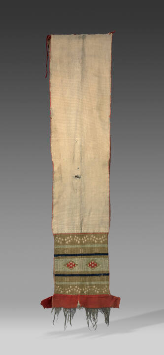 DescriptionRed bayeta flannel, red "s"-spun ravel embroidery, blue handspun wool, 3-ply cotton warp, plain weave manufacture, 4-ply Germantown yarn embroideryGallery LabelWoven around 1875, this dance sash is one of the earliest surviving textiles of its kind. It is constructed of two cotton bands embellished at the ends in wool with a technique called brocade embroidery. The two identical bands were joined at the top by loose stitching, forming a long sash of the type worn by male dancers in most Pueblo ceremonies and by many of the Pueblo supernatural beings called Katsinas. The design itself, comprised of elements that have remained unchanged to the present, represents the mask of the Broad Face Katsina. While weaving was done historically in all Pueblos, many ceremonial textiles such as this were woven by Hopi men and traded to other communities.