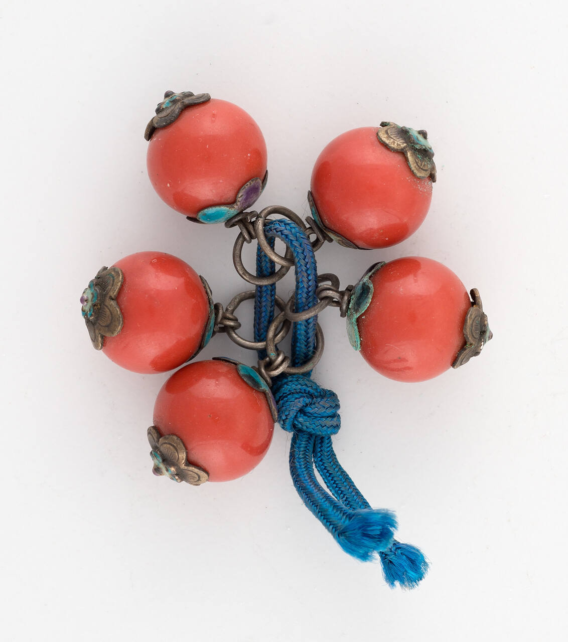 DescriptionSet of five round, clear glass buttons with petal ends of gilt and blue enamel.