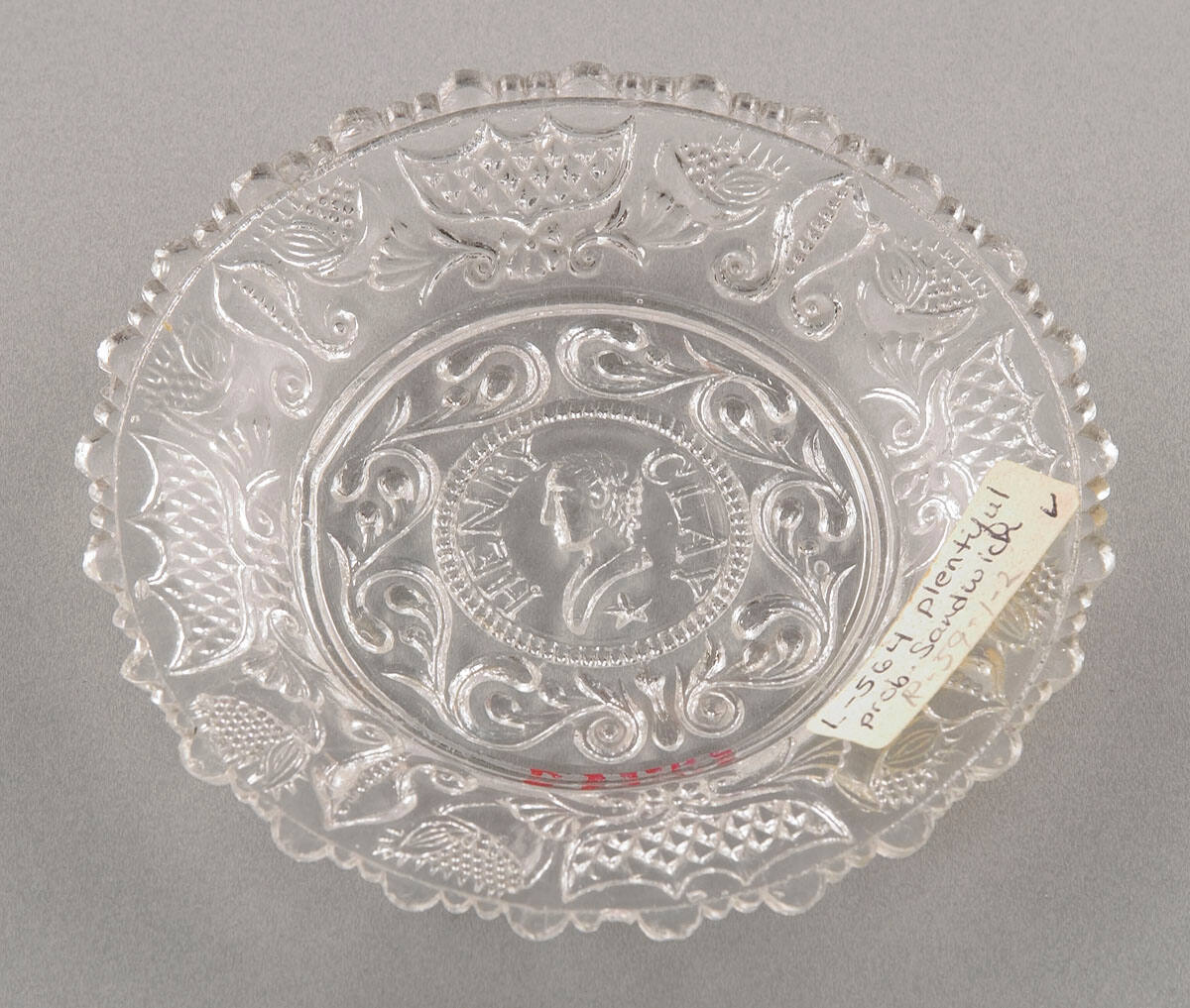 Description"Henry Clay" historical cup plate. Portrait bust facing left with name Henry on left side, Clay on right and single star below bust. One burder thistle and floral designs. Clear glass. 25 large scallopes with two small between on rim. Probably Sandwich glass.
