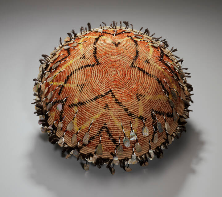 DescriptionBone buttons on handles and around top. Small black feathers woven in around top. black beads.Gallery LabelAs this highly embellished basket demonstrates, Pomo weavers achieved complicated visual effects with diverse materials. The layered star-shaped pattern enhances the mosaic of textures created by fiber, shell, feather and glass beads. Feather baskets were frequently made to honor the dead. During cremations or at memorial ceremonies one year following a death, baskets were burned along with other possessions of the deceased. In part, these funerary traditions account for the rarity of older works.