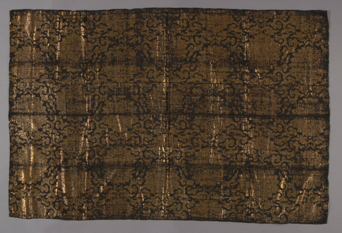 DescriptionBlack and gold brocade hanging with a lotus design.