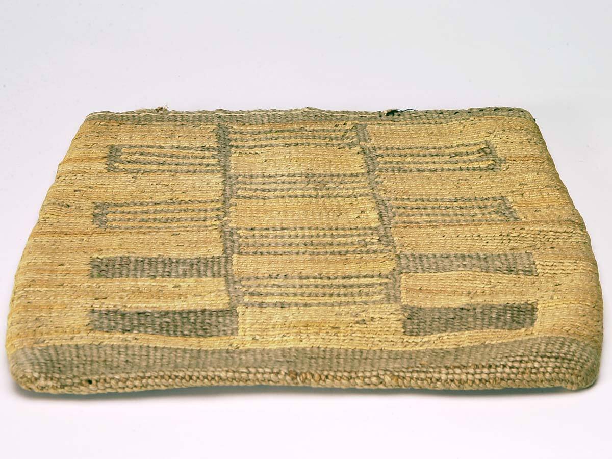 DescriptionWrapped cornhusk design in soft gold and green native dyes. lozenges on one side, geometric designs on opposite side.