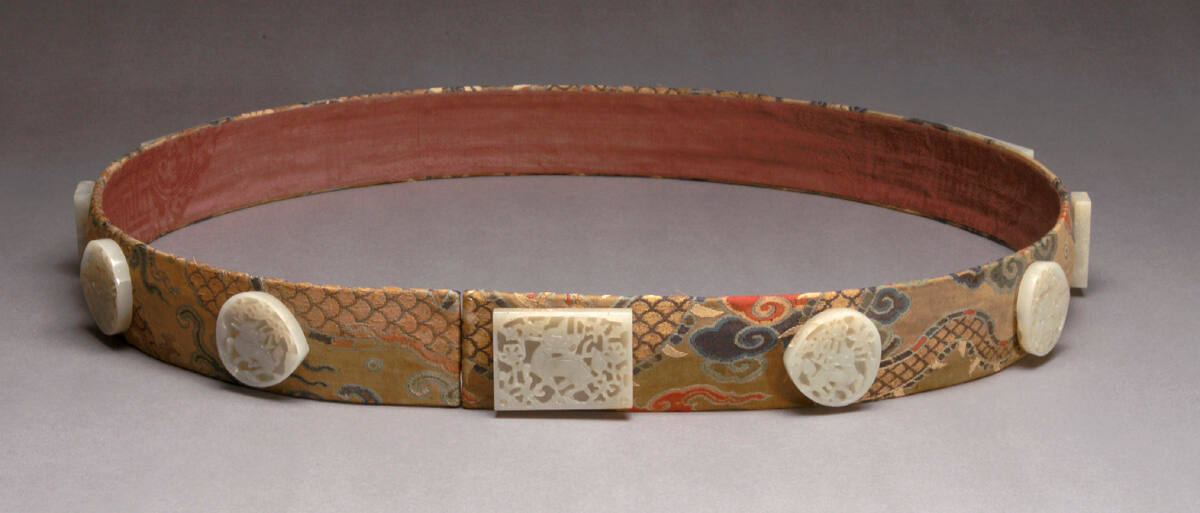 DescriptionRed, green and gold brocade covering a stiffened base. Four oval shaped, six large rectangles and two small ones of carved white jade.