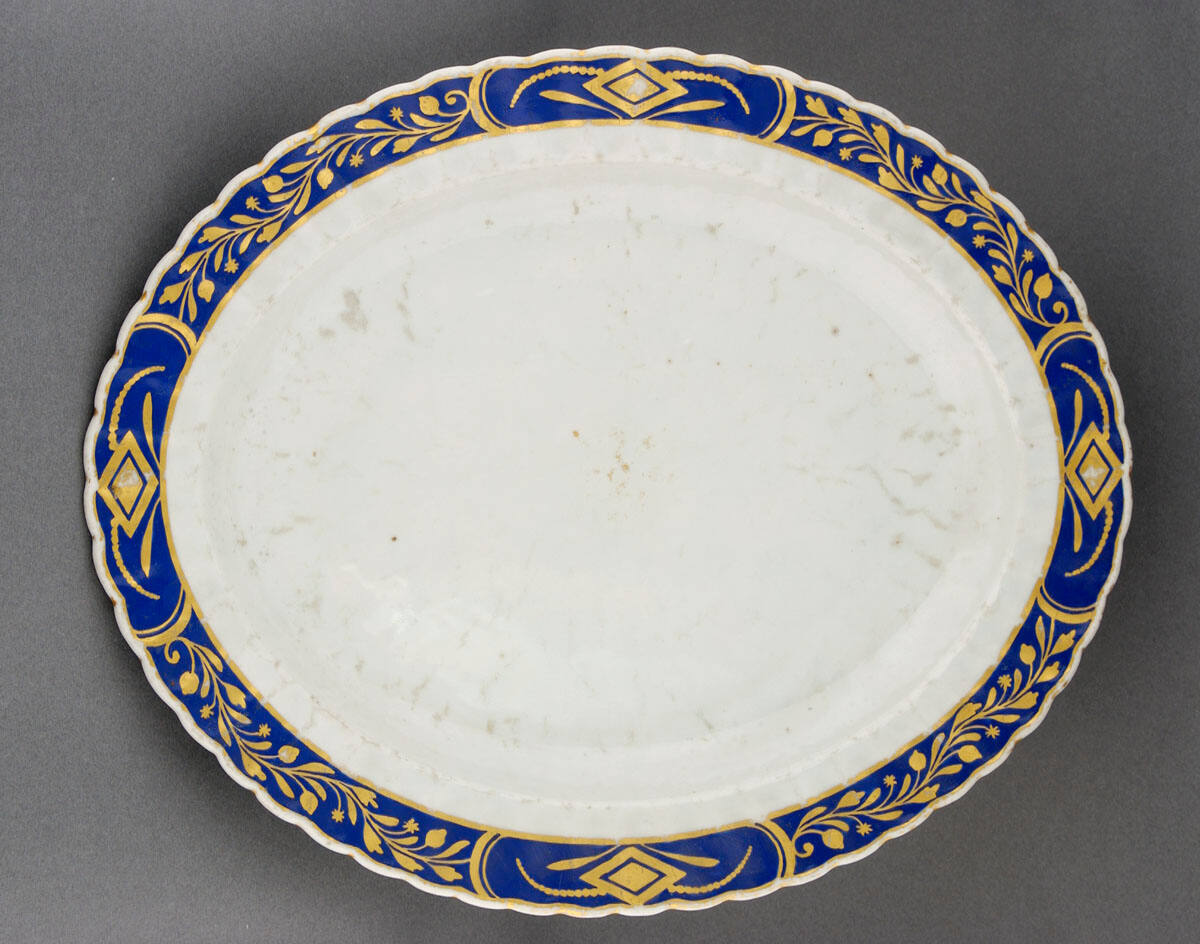 DescriptionWide blue and gold borders, alternating floral and lozenge design.