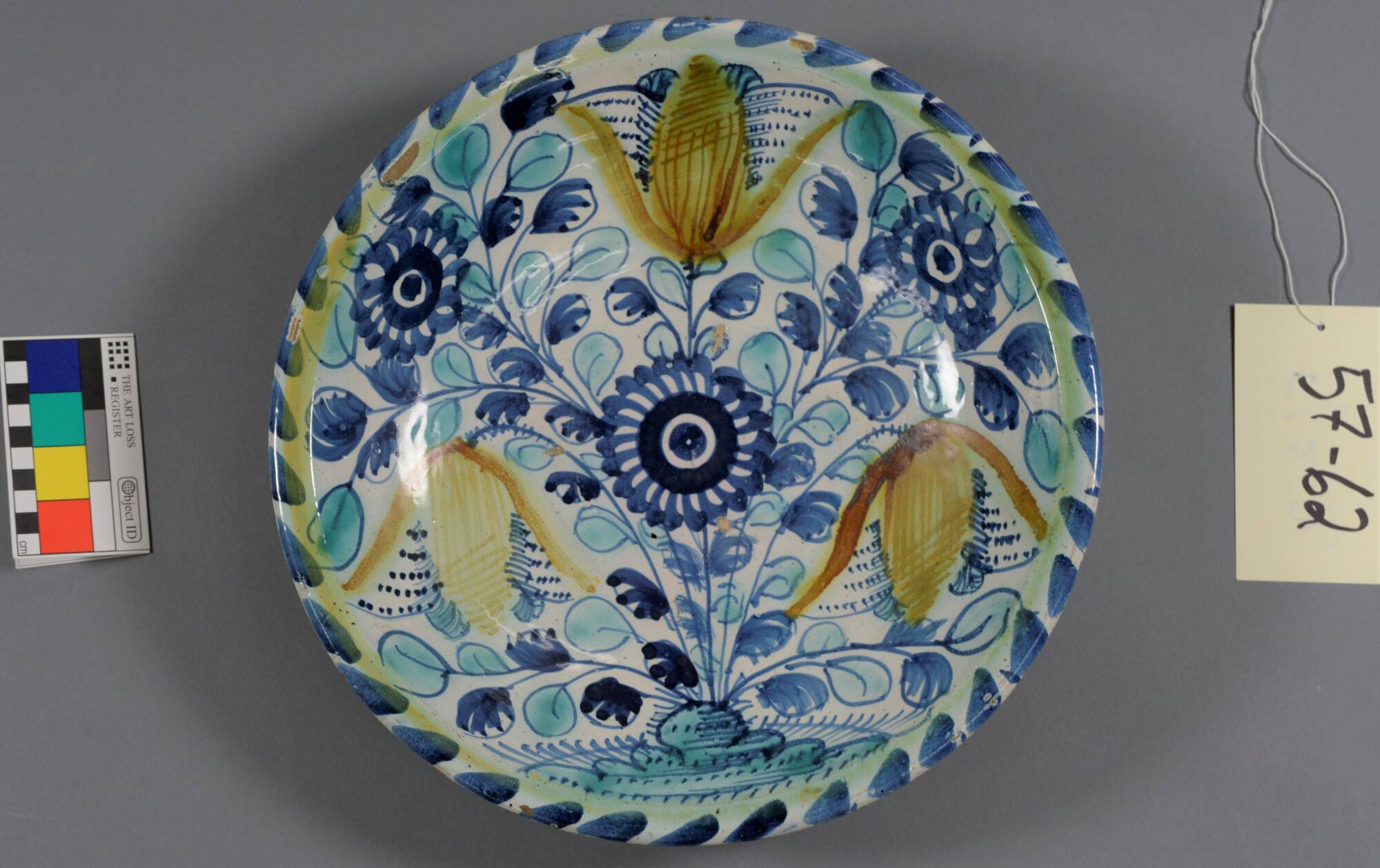 DescriptionDecorated with three yellow tulips and three blue, daisy-like flowers, the leaves in green and blue, the stems blue. Blue-dash border.
