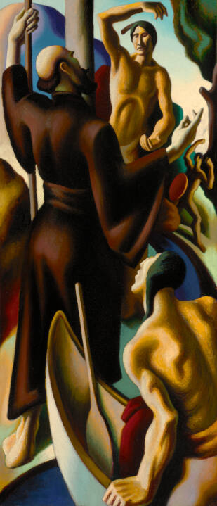 Thomas Hart Benton initially conceived of American Historical Epic while serving in the Navy during World War I. He set to work on it soon after the end of the war, aspiring to create seventy-five panels illustrating American history from the arrival of European explorers to his own day. He abandoned the series in the winter of 1926, having grown tired of its historical subject matter. He had completed two “chapters,” including the ten panels on view here. Related panels are held by various public and private collections across the country.