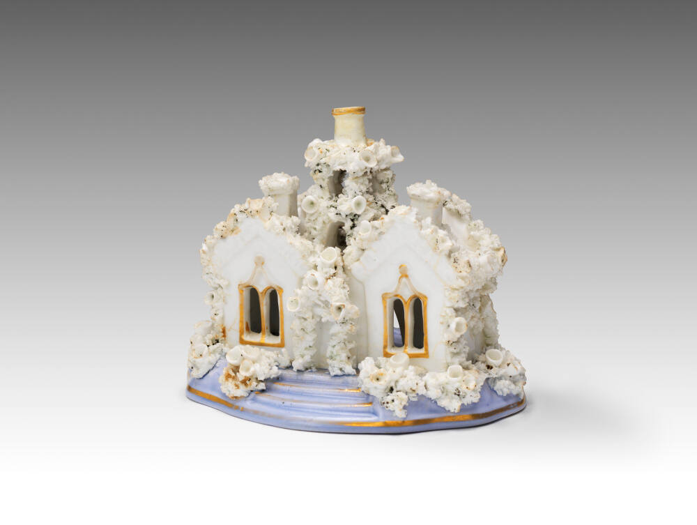 DescriptionWhite cottage with traces of gilt around double windows and central chimney. A profusion of white flowering vines and bushes on powder-blue attached base. Touches of gilt.Exhibition HistoryCastles, Cottages, and Crime, The Nelson-Atkins Museum of Art, Kansas City, Missouri, July 10 2021–March 06 2022, no cat.