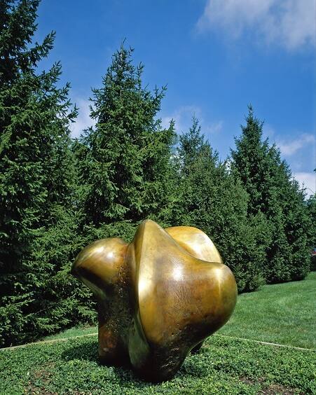Three-Way Piece No. 1: Points is named for the bulging forms that make up the mass of the sculpture and the three tapering points that support it. An abstract sculpture, it was inspired by the artist's abiding interest in stones and bones. Here, textural surfaces and colors alternate, ranging from smooth to deeply gouged, and from golden to rich brown.