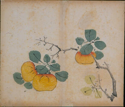Colorful, lush fruits, not common in Chinese painting, are abundant in The Ten Bamboo Studio. These images are the printmakers' attempt to create a graphic effect of bright colors and patterns that are not easily achieved through brushwork. The dimple patterns on the citrus peels were created by using a cut-away block for the final print to reveal the lighter background.