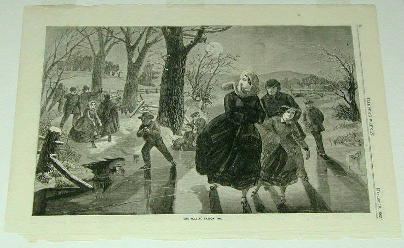 DescriptionA page removed from an edition of "Harper's Weekly." Depicts female and male skaters on a pond.